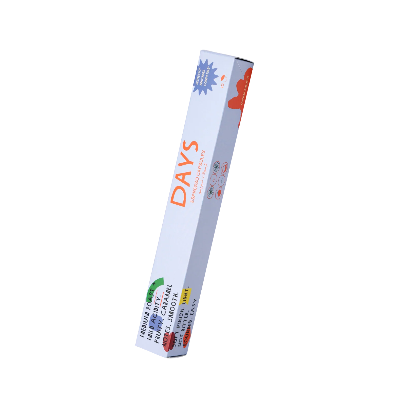 تخيّل الأمر كأشعة الشمس في فنجان: إسبريسو خفيف ومتوازن يجعل طقوس قهوتك سهلة ومريحة. مثالي للصباحات التي ترغب فيها بقهوة هادئة ومريحة وهادئة.