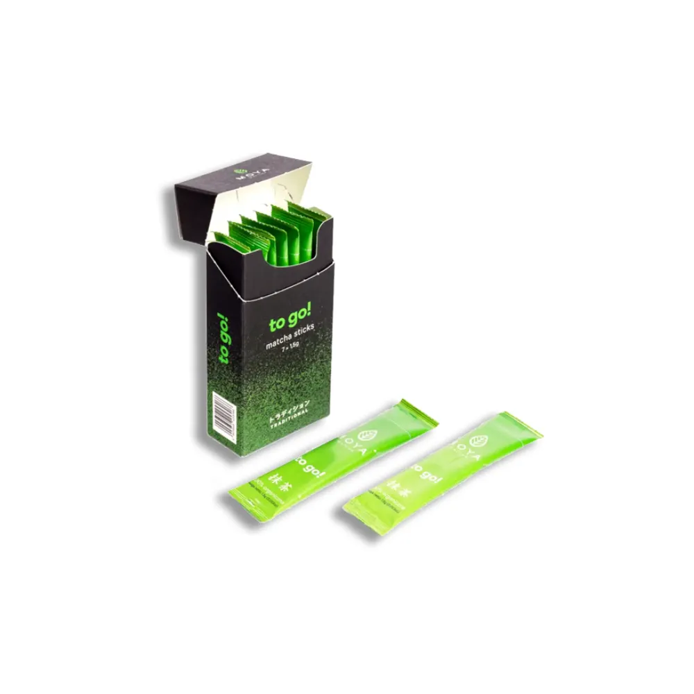 Moya Matcha To Go! is a handy form of organic Moya Matcha Traditional packed in uni-dose sticks that can be prepared hot or cold. Moya Matcha To Go! is packed in boxes containing 24 or 7 sticks with 1,5g of organic matcha in each. It is best mixed in the Moya Matcha glass shaker.